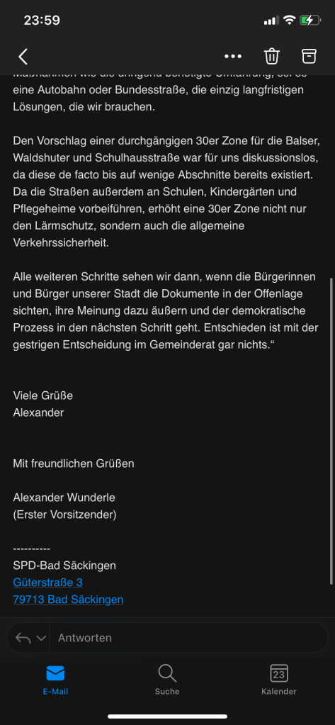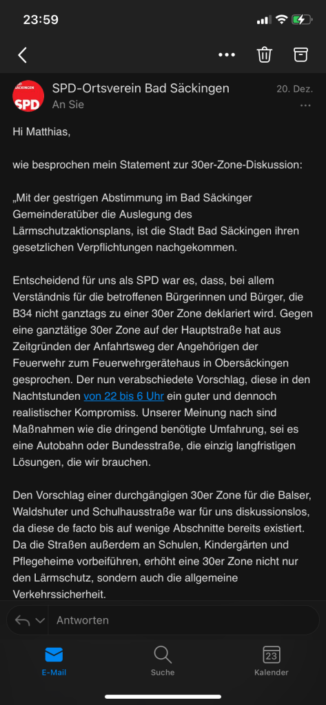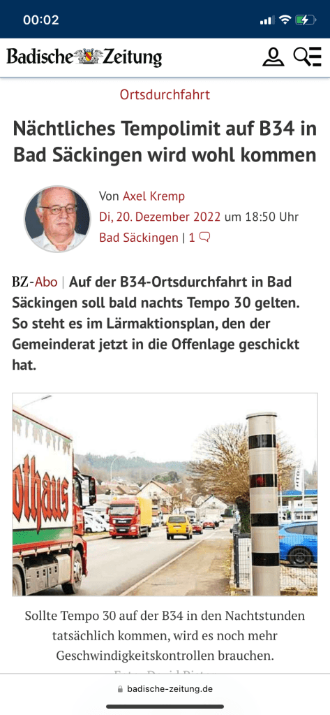 Ich kenne keinen einzigen der auf die Idee kommen würde bei allen anderen Problemen die wir gerade haben jetzt mit einer 30er Zone für die Hauptstraße zu kommen. Vor allem vor dem Hintegrund, dass Säckingen eh schon langsam genug ist und jeder am Beispiel Schwörstadt sehen kann, wie nervig so eine durchgezogene 30er Zone sein kann.